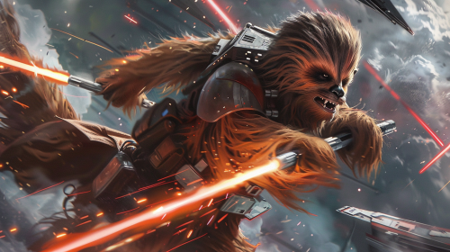 Painting of a Wookie Jedi with brown hair, brown eyes, confident, flying a space ship, fighting on the battlefield, epic pose, majestic pose, extremely detailed, Alex Ross artwork style --ar 16:9 --v 6.0