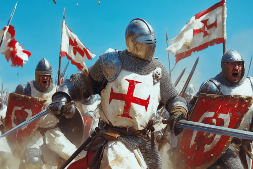 a realisitc 19th century painting of King Baldwin IV of Jerusalem, age 16, leading his knights with and intense Frenzy and focus in a close fight the battle of Montsigard against Saladin and his men. The sun blazes in the clear blue sky --ar 3:2