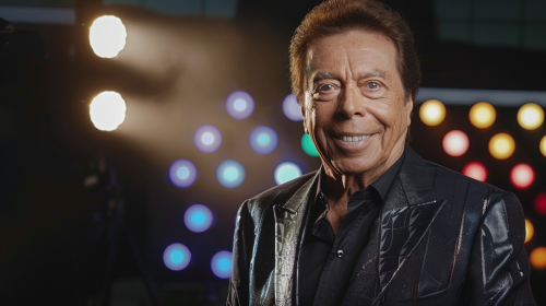 Uma fotografia de Silvio Santos, Ãcone do SBT, mostrando a lÃngua para a televisão, com uma expressão brincalhona e descontraÃda. O cenário é um estúdio de TV moderno, com luzes brilhantes ao fundo e reflexos suaves no chão. Silvio Santos está de frente para a câmera, em um ângulo ligeiramente de baixo para cima, enfatizando sua postura carismática e o gesto ousado. As cores do fundo são suaves, predominando o azul e o branco, com iluminação de estúdio profissional, capturada com uma câmera DSLR de alta resolução, estilo realista. hd quality, natural look --ar 16:9 --v 6.0