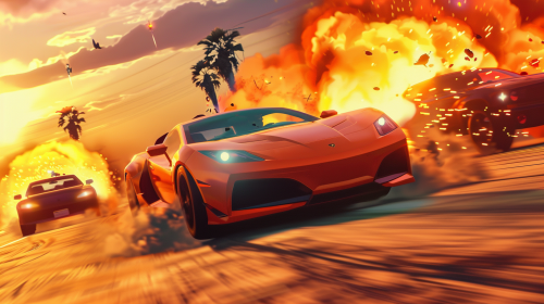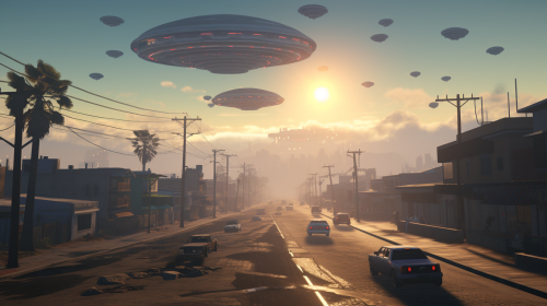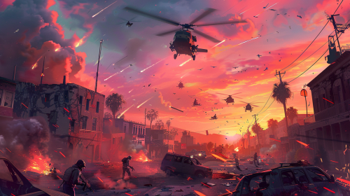 Create a tense and dynamic scene in Los Santos, inspired by the realistic style of GTA V, but in a PUBG battle royale format. Terrorist and military helicopters circle the sky, we have to focus on people parachuting amid the chaos. On the ground, intense firefights occur, with sporadic explosions lighting up the scene. The detailed cityscape of Los Santos' vinewood backdrop serves as the backdrop for this epic battle, with abandoned cars, damaged buildings and the presence of iconic elements of the city. --ar 16:9