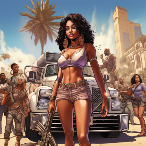 Create a tense and dynamic scene in Los Santos in a vivid environment, inspired by the realistic style of GTA V, but in a PUBG battle royale format. Terrorist and military helicopters circle the sky, we have to focus on people parachuting amid the chaos. On the ground, intense firefights occur, with sporadic explosions lighting up the scene. The detailed cityscape of Los Santos' vinewood backdrop serves as the backdrop for this epic battle, with abandoned cars, damaged buildings and the presence of iconic elements of the city. --ar 16:9
