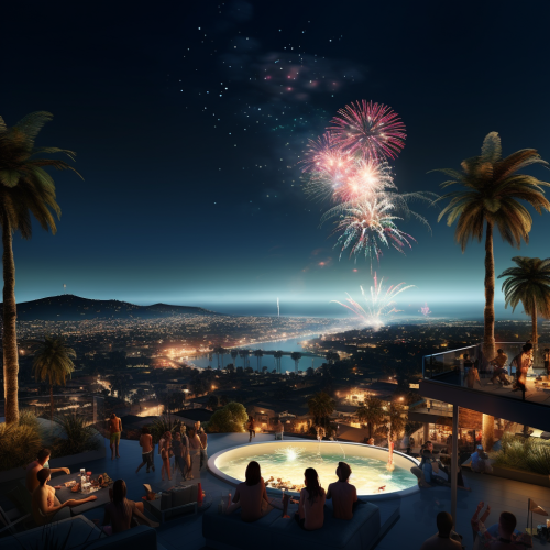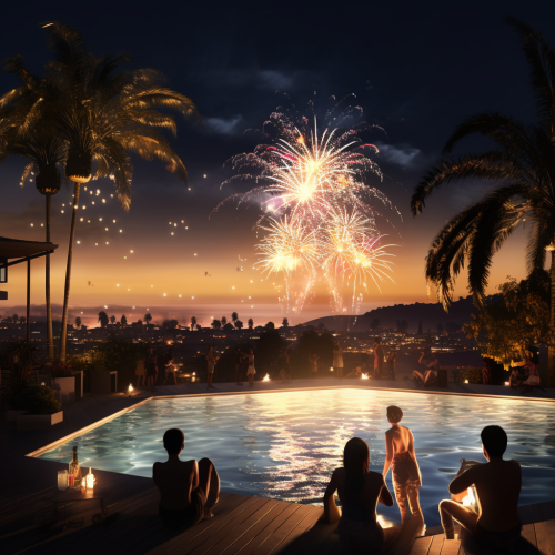 los santos at night from a pool party view, fireworks in sky, night time, yellow water 4k hyperrealistic