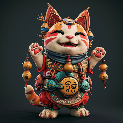 maneki-neko game character for a battle-royale money game, cat looks aggressive and cool, high poly design, vivid colors --v 5.2 --s 750