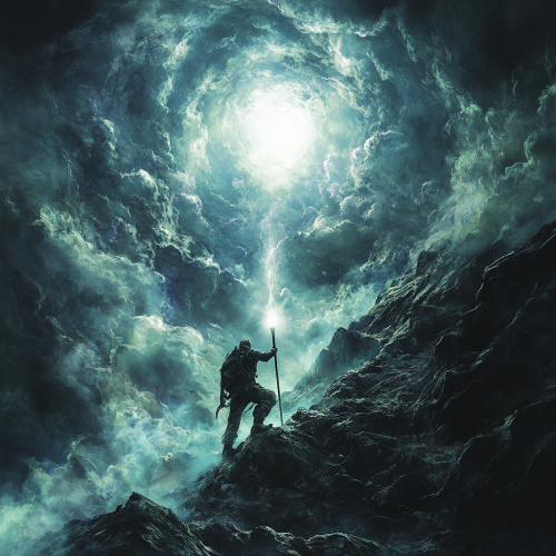 This cover shows the cyborg climbing the steep side of a craggy mountain. The sky above is a tumultuous blend of dark clouds and swirling vortexes. Clutched in the cyborg's grip is the staff, now extending towards the sky, channeling a beam of light that begins to part the clouds. The dramatic contrast of dark mountain shadows and the bright light from the orb creates a powerful visual of struggle and hope. The predominant colors are dark grays and flashes of white light. --s 250