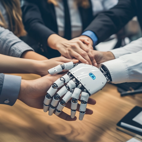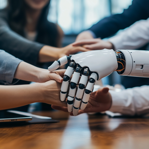 Photograph of a business team with their hands together in the office, one hand is a robot hand, depicting the concept of success and unity. The business people are holding arms in the style of teamwork and support with a copy space on the table. Stock photo contest winner, with high resolution, high quality, and high detail, ar 16:9