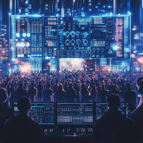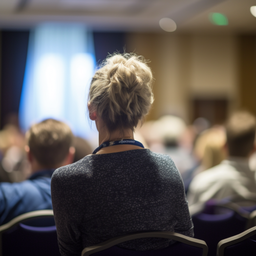 stock photo, woman presenting at conference, view from behind, audience out of focus --v 5.0