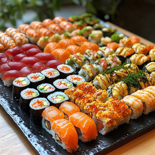 luxury sushi set 108. Eye2 Party Menu = 174PCMild Ei Melk Schaaldieren Sesam Vis Veganistisch Halal Dragon salmon 16 pc Crispy chicken 16pc Crunch shrimp 16 pc Eye2 ura salmon 16 pc Ura california 16 pc Ura veg spice 16 pc maki crab 12 pc maki cucumber 12 pc maki tuna 12 pc Maki avocado 12 pc Sashimi salmon10 pc Sashimi fried shrimp 10 pc Nigiri salmon 10 pc From sushieye2 restaurant Realistic photo realistic true food insta photo