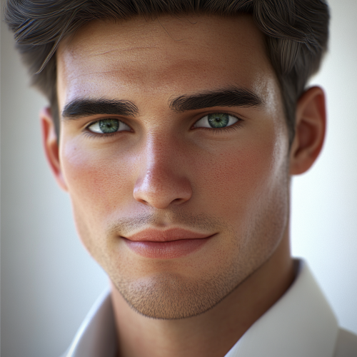 Photoreal. close up. A human male employee in his 20s. slant eyes & slim body. He pretends to be arrogant and acts confident. He has a faint smile on his face. It has small horns.