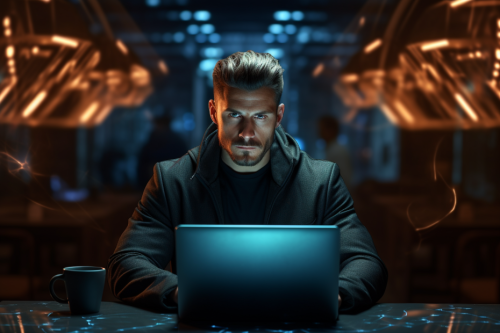 business stock photo of a man sitting in front of the laptop, cyber security, cyber, illumination, 8k, correct details, photorealistic, photography, --ar 3:2 --v