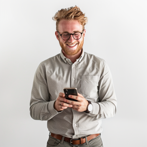 A photorealistic independent Male 25 to 33 years old, very positiv and smiling infront of a white backdrop, looking very motivated and seems to be very confident in a Sporty business casual look, he is holding a phone in his hands and looking at it. he seems very satisfied. high realistic photo taken in a proffesional Photostudio. very clear and crisp appearance, exposure time 125 sec. to 250 sec. ISO 100 to 200, aperture 8 ,