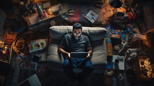 top-down photograph of indian-american man on couch, laptop, notebooks, paperwork, files, photos, busy focused man, night time, cinematic colorful lighting --ar 16:9