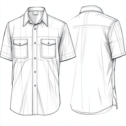 Create an illustration of a short-sleeve shirt design with both front and back views, similar to a technical flat drawing. The shirt should feature a large abstract pattern with intersecting lines and visible stitching details. Ensure that the entire shirt is shown clearly, including both sleeves on the front and back views, without any parts getting cut off. The illustration should be centered with a clear white border around it to ensure all edges of the shirt are visible. The background should be plain white to provide a clean and unobstructed view of the shirt designs.