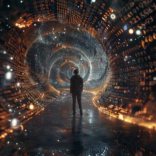 A hyper-realistic AI avatar standing at the intersection of two abstract, swirling pathways--one path filled with characters, words, and grammar rules in #b50057 and #62165c, while the other path contains formulas, algorithms, and number sequences in #4a1f69 and #1c3075. The avatar glows with intelligence, representing the prodigious blend of linguistic and mathematical prowess, with smooth, polished surfaces and minimalist accents enhancing the futuristic ambiance., cinematic, hyperrealistic --ar 1:1 --v 6.0