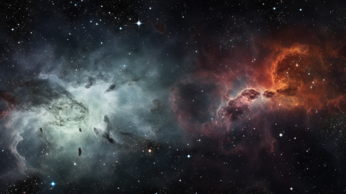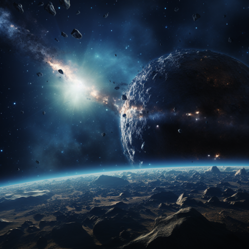 A deep space backdrop filled with stars, with a large, menacing asteroid on the left side of the frame, moving toward Earth on the right side.