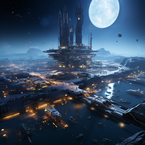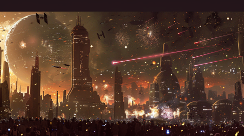 A grand panoramic view of a celebration in the city of Coruscant (from Star Wars), with fireworks, ships flying in the sky, imposing skyscrapers and thousands of people celebrating; in the 1990s science fiction illustration style, capturing the essence of classic Space Opera aesthetics, richly detailed with interstellar debris and deep shadows --ar 16:9