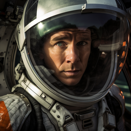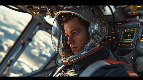 Photorealistic interstellar pilot with a partially unzipped space helmet, showing a focused face, set against a futuristic spaceship control panel --ar 16:9 --v 6.0