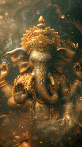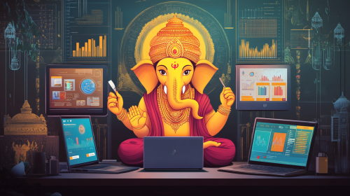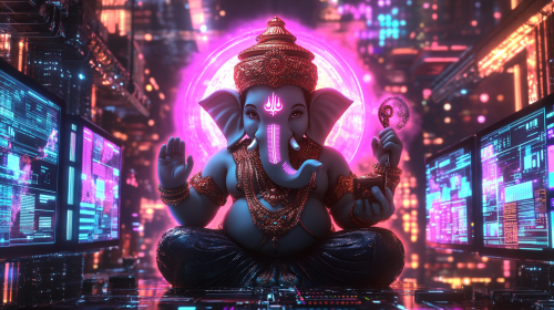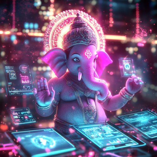 Generate a high-resolution animation of Lord Ganesha in a dynamic digital marketing environment. Depict Ganesha as a wise and modern guru, surrounded by swirling screens, laptops, and tablets showcasing digital marketing metrics, graphs, and tools. Incorporate vibrant, glowing neon lights and subtle particle effects to give the scene a futuristic feel. Animation sequence: Ganesha appears in a burst of light, holding a stylus in his trunk. Screens and devices flicker to life, displaying digital marketing data and visuals. Ganesha gestures with his hands, and the screens respond with dynamic animations and transitions. The camera zooms out to reveal a futuristic cityscape with Indian architectural elements in the background. The animation ends with Ganesha smiling, surrounded by a halo of light, as the screens and devices fade into the background. Style: High-resolution (4K or higher) Vibrant, neon color palette with shades of pink, blue, gold, and purple Dynamic camera movements and transitions Incorporate subtle particle effects, glow, and lens flares Blend traditional Indian elements with futuristic and modern digital marketing themes --ar 16:9