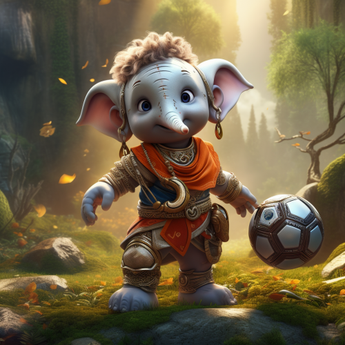 lord Ganesha as cute kid, playing with football, forest, river, cinematic, 4k, unreal engine, HDR