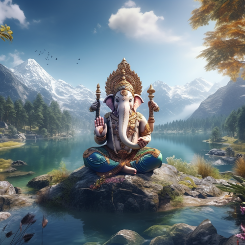 Hindu god lord Ganesha, peacock feather crown, small mouse sitting near feet of lord Ganesha, snow mountains, river,alpine trees, 4k , hyperrealistic, unreal engine, cinematic, HDR