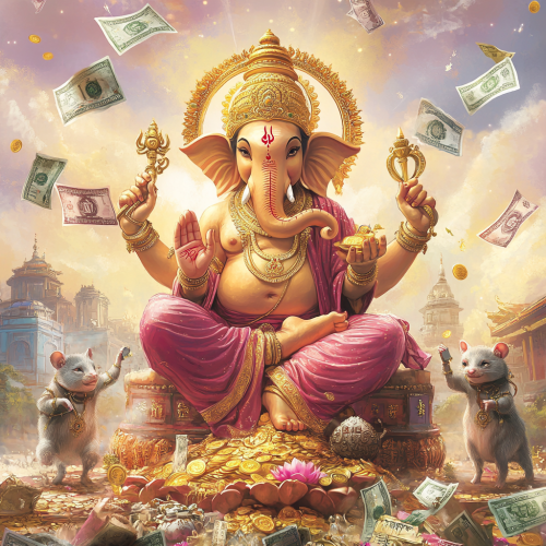 lord Ganesha, peacock feather crown, decorated mouse with gold saddle on mouse back, cinematic, hyperrealistic