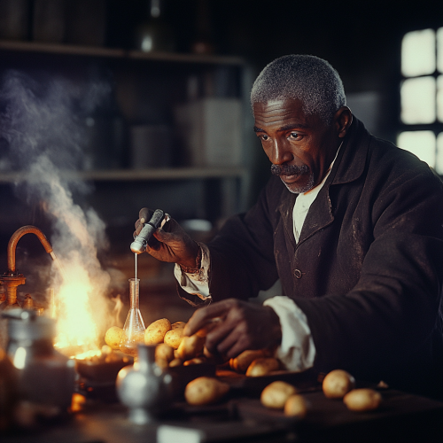 historical color photo of George Washington Carver in a dimly lit, early 1900s lab working experiments with sweet potatoes and peanuts. he is holding a bunsen burner.