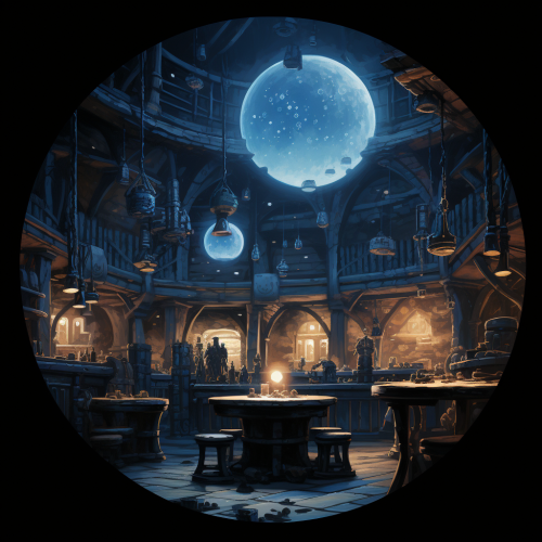 In the dimly lit tavern, the large sphere at its center emanates a soothing blue glow, casting mysterious shadows. The 50 finger-sized holes on its surface seem to beckon with unknown secrets, inviting exploration.