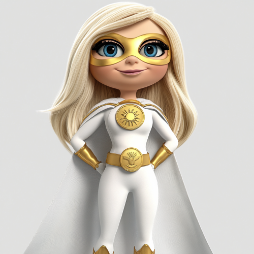 A muppet style basic puppet of Cute blonde female superhero with blue eyes, wearing a white and gold costume with a white cape, exagerated features, big lips, and very long hair, in the style of a Muppet show character, full-body shot, plain background, puppetcore, 3D rendering, high resolution, high quality. and a capelet, costume should be primarily white with gold accents, gold around the neck and shoulders, as well as the belt with a sun for a logo, Muppet show character skin
