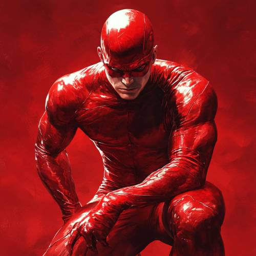 AAA comic book cover illustration / full body male superhero character / shiny obsidian skin / adorned in a skintight all-red costume / dynamic action pose / stern facial expression --v 6.1 --stylize 250 --c 3 --style raw --weird 3