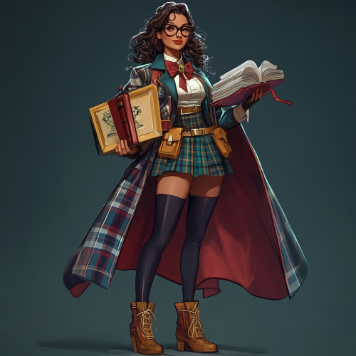Lady Victory in a back-to-school themed costume. Her iconic superhero suit is modified with school-themed accessories, including a patriotic and a school crest emblem. She wears a school blazer and has a pencil-themed belt. She holds a stack of books and a ruler as props. The costume is dynamic, colorful, and blends superhero and school elements. The overall style is vibrant and detailed.