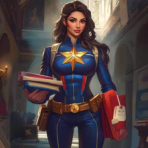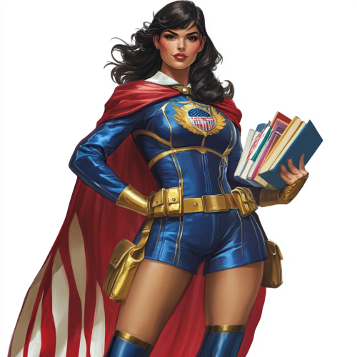Lady Victory in a back-to-school themed superhero costume. Her iconic superhero suit is modified with school-themed accessories, including a patriotic and a school crest emblem. She wears a cape that resembles a school blazer and has a pencil-themed belt. She holds a stack of books and a ruler as props. The costume is dynamic, colorful, and blends superhero and school elements. The overall style is vibrant and detailed.