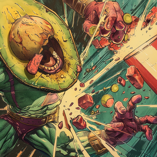 avocado super hero cut in half no stone fighting his nemesis, bacon man. Drawn in a 1980s marvel comic style like howard chaykin