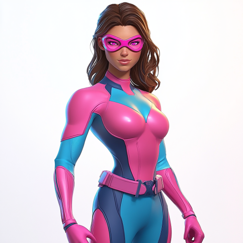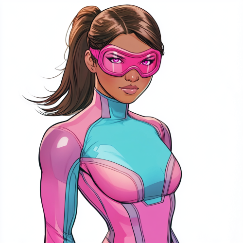 A confident and charismatic Latina superhero with enhanced speed abilities, donning a sleek form-fitting costume in shades of pink with blue accents. Her outfit accentuates her physique, while pink goggles protect her eyes. Her brown hair is styled in a ponytail, and her striking pink eyes exude power and determination as she prepares to race into action.