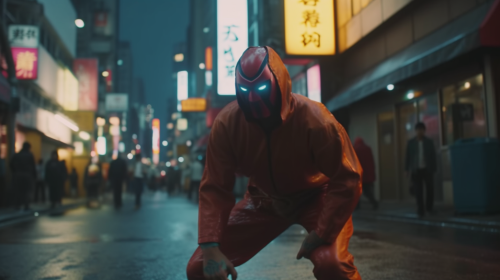 cinematic shot of a japanese superhero in an epic fighting scene doing a dynamic fighting pose at the streets of akihabara, colorful, hyperrealistic, movie, UHD, 4K --ar 16:9 --s 250 --v 5.0