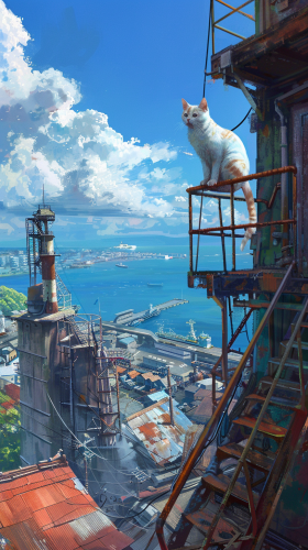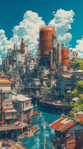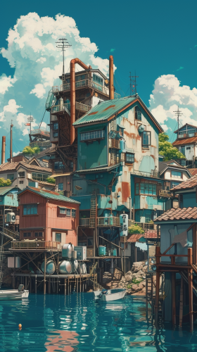 Maritime city. Buildings from the Showa era. There are many factories and houses built on rusted offshore platforms. blue sky. summer sky. studio ghibli style. anime. --ar 9:16 --v 6.0