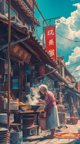 A Chinese restaurant from the Showa era. arcade street. Grandma is cooking.blue sky. studio ghibli style. anime. --ar 9:16 --v 6.0