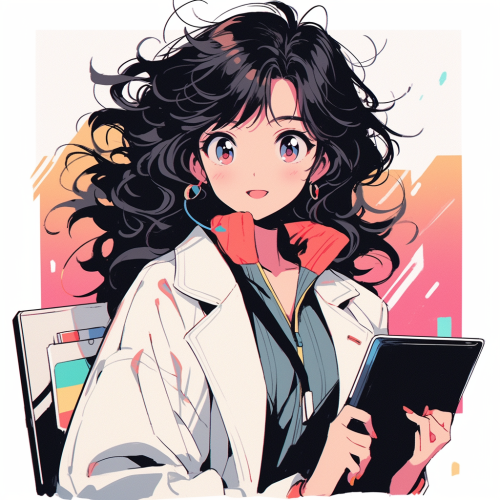 Style of 80's citypop, holding a laptop, wearing a white coat, upper body, young Japanese girl, joyful, showa style, simple background, white background, Flat illustration, 2d: 2, retroism, strong color contrast, convertible, vintage, Fresh, pure, High contrast, high saturation, restore ancient ways --ar 1:1 --s 1000 --niji 5