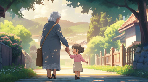 An elderly grandmother and her grandchild are walking hand in hand,Produce an image that transports viewers to a Ghibli-esque Showa era, where every element is infused with wonder and enchantment --ar 16:9 --niji 5