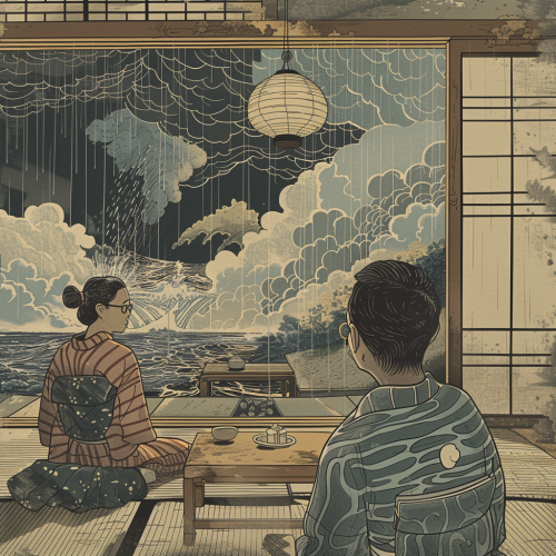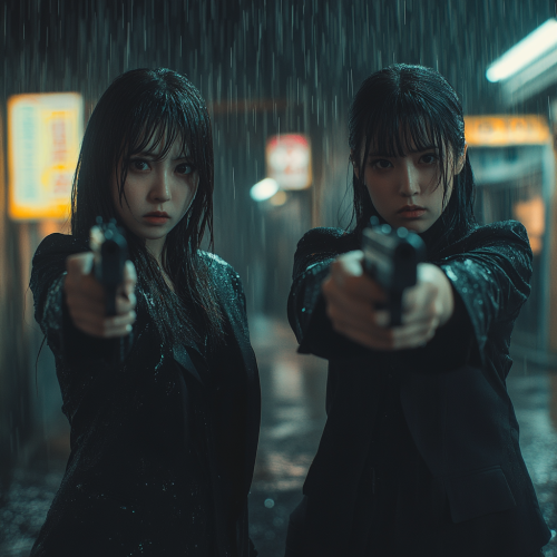 Two Japanese sisters in their mid-30s are standing in the rain, pointing their guns at one another. The scene has a gritty, 70s grainy film vibe, with a moody, cinematic atmosphere. Both sisters are dressed in black clothes, but the one with long, wet hair is wearing a sharp black suit, while the other with a sleek bob cut is in a black outfit. The rain creates a dramatic effect, with water droplets visible in the dim light. The background is a dark, urban setting with subtle neon reflections, enhancing the intense and suspenseful mood of the confrontation. They resemble Showa era actors.The color palette uses deep, muted tones with the following colors: #000000 for the sisters' clothes and the night sky, #24270c and #37321a for the shadows and background details, #31473b and #4a6554 for the subtle neon reflections, and #ac8e45, #896622, #c37429, #894a17, and #b70002 for additional highlights and accents throughout the scene.