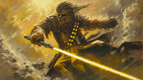 Painting of a Wookie Jedi with brown hair, brown eyes, confident, wielding a yellow lightsaber, fighting a sith on the battlefield, epic pose, majestic pose, extremely detailed, Alex Ross artwork style --ar 16:9 --v 6.0