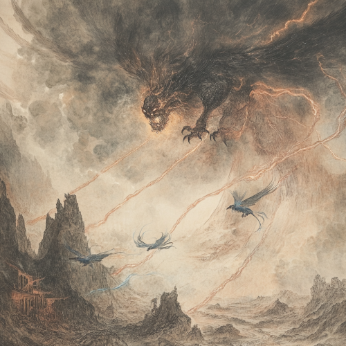 An epic battle in the stormy skies, featuring Lifedrinker, a colossal, shadowy, monstrous entity twice the size of the Burj Khalifa, with dark, crackling tendrils reaching out in all directions. Its body is amorphous, covered in a swirling, smoky mist, with glowing, malevolent eyes and faintly visible, shifting patterns that resemble cosmic voids. Opposing it are three massive Thunderbirds, mythical avian creatures with wingspans like commercial airliners. Their feathers shimmer in electric blues and silvers, their eyes glow with an unearthly light, and they are surrounded by arcs of lightning as they dive and attack. The scene is set against a dark, stormy sky, with clouds churning and lightning illuminating the chaos. Lifedrinker’s tendrils lash out towards the Thunderbirds, while one Thunderbird unleashes a bolt of lightning at the creature's core. The landscape below shows cracked earth and patches of glowing dark energy, hinting at the creature's destructive power. The atmosphere is tense and dramatic, capturing the clash between ancient mythical forces and a terrifying, otherworldly monstrosity. --sref 8282024