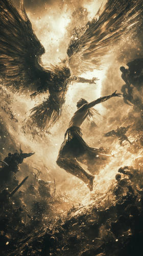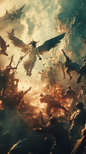 cinematic epic battle of angels vs demons, zack snyder 300 style film style, in the style of flowing textures, energetic gestures, iso 200, lo-fi aesthetics, energy-charged, focus on joints/connections. --ar 9:16 --style raw --v 6.1