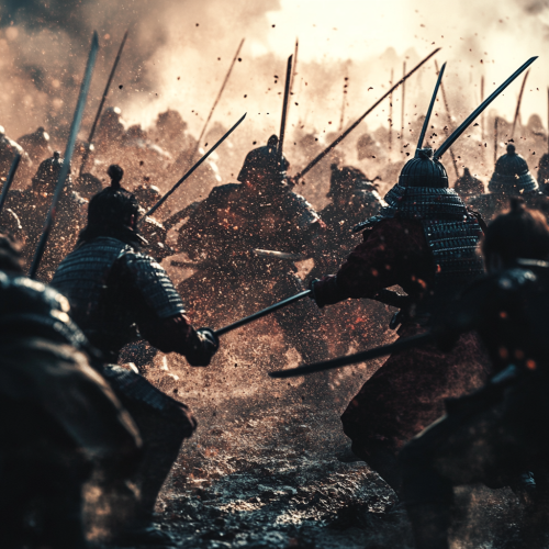 a fierce battle between the Samurai and the Mongols. Show the chaos of battle swords clashing. Hyper realistic. Photographic. UHD. Dramatic imagery. High contrast. Action shot. Candid 8K