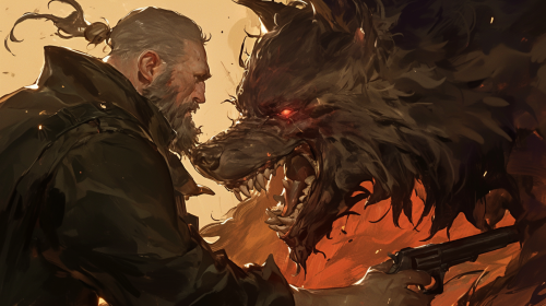 A tense battle scene from behind the shoulder of a large, 40-year-old man with a broken nose, rugged like a boxer, and the muscular build of a massive middle-aged man. boxer-built man with slicked-back hair and closely shaved temples, dressed in a leather jacket. He faces a fierce, skeletal wolf with glowing ruby-red eyes, lunging mid-air with its jaws open. The man holds a pistol aimed at the charging wolf. In the background, there’s an old, single-story stone farmhouse under a threatening sky with storm clouds forming, capturing the intensity and darkness of the moment. Hyper-realistic, dynamic lighting, cinematic composition, dramatic shadows. His appearance suggests he's a police officer, with hints in his attire and demeanor. Dark, moody atmosphere with intricate details, cinematic lighting, high-definition, 2D anime style --ar 16:9 --niji 6