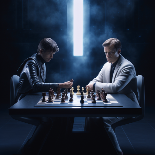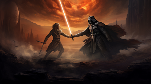 oil on canvas, a jedi knight and sith lord fighting on a baren planet at night. We can see other planets and stars in the background. Gritty, moody and dramatic. --ar 16:9