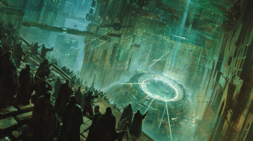 Painting of dozens of Jedi imprisoning a Sith in an energy prison in the shape of a luminous cylinder, highly detailed, dark fantasy aesthetics, futuristic technology, Star Wars, John Berkey, Peter Elson, John Harris, Ralph McQuarrie --ar 16:9