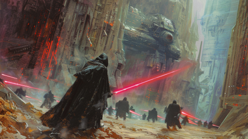 Painting of groups of Jedi spies infiltrating Sith headquarters and stealing Sith artifacts, highly detailed, dark fantasy aesthetic, futuristic technology, Star Wars, John Berkey, Peter Elson, John Harris, Ralph McQuarrie --ar 16:9