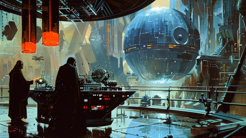 Painting of a Jedi spy infiltrating the interior of a Sith Intelligence office and stealing Sith artifacts, highly detailed, futuristic technology, Star Wars, John Berkey, Peter Elson, John Harris, Ralph McQuarrie --ar 16:9