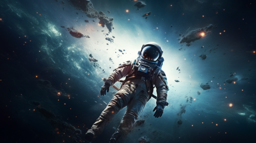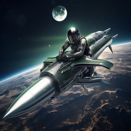 Ultra-realistic image depicting an astronaut piloting a sleek rocket across the vast expanse of the galaxy. The rocket, designed with a modern aesthetic, occupies the center of the image, attracting attention with its aerodynamic shape and shiny metallic green surface. The astronaut, inspired by the iconic images of the first moon landing, is visible through the cabin, focused and determined. The galactic scenery is a mesmerizing display of vibrant cosmic colors, dotted with stars, planets and celestial formations reminiscent of the grandeur of space exploration. The scene evokes a sense of adventure and discovery as the astronaut propels the rocket through cosmic wonders, echoing the spirit of exploration seen in historic lunar missions.