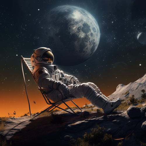 astronaut sitting in a lawn chair on the moon enjoying the galaxy in front of him