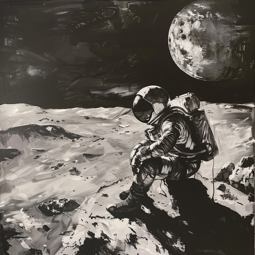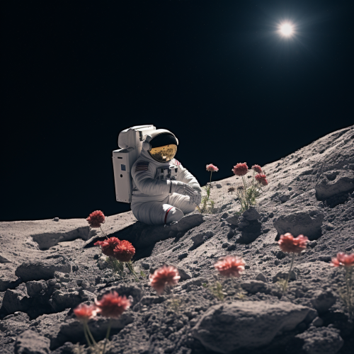 astronaut resting on moon crater with flower, earth in the didstance, photo real, 200mm lens